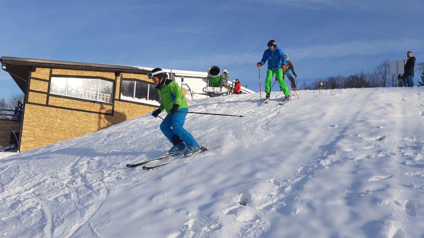 Bereits zu Tagesanbruch waren unsere drei Athleten mit den drei Betreuern Udo, Lars und René am Hang in Erlbach. Die Bedingungen waren nahezu perfekt. Leichte Minusgrade, eine perfekt präparierte Piste und erste Sonnenstrahlen, die sich durch den sich auflösenden Hochnebel drängten.