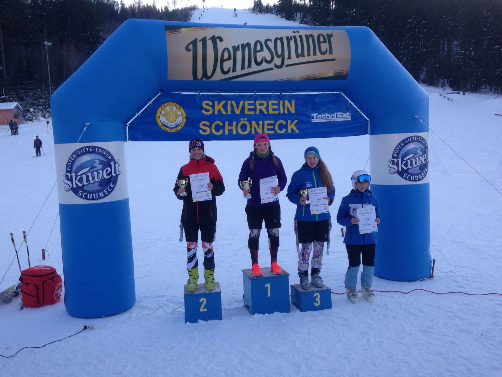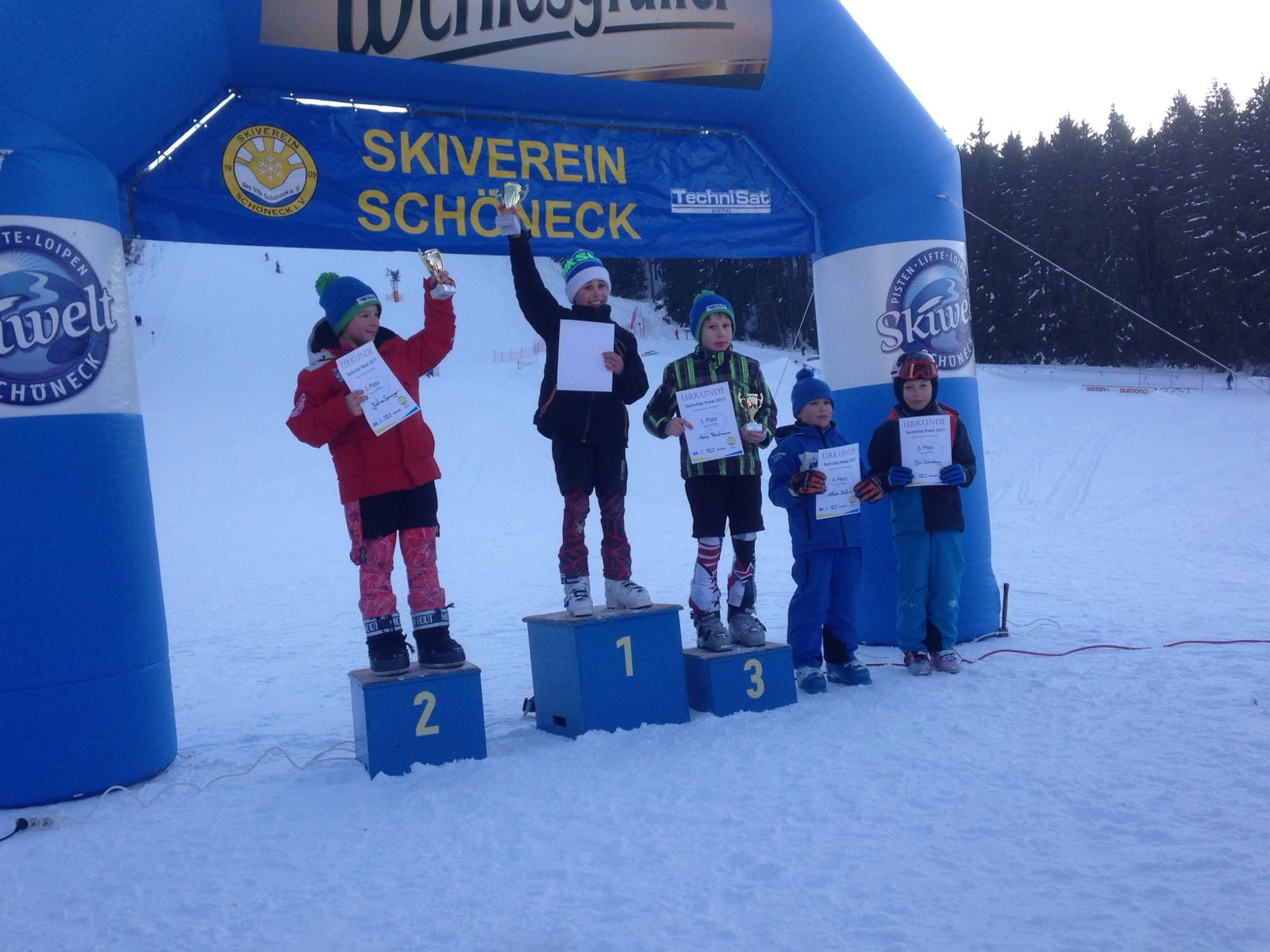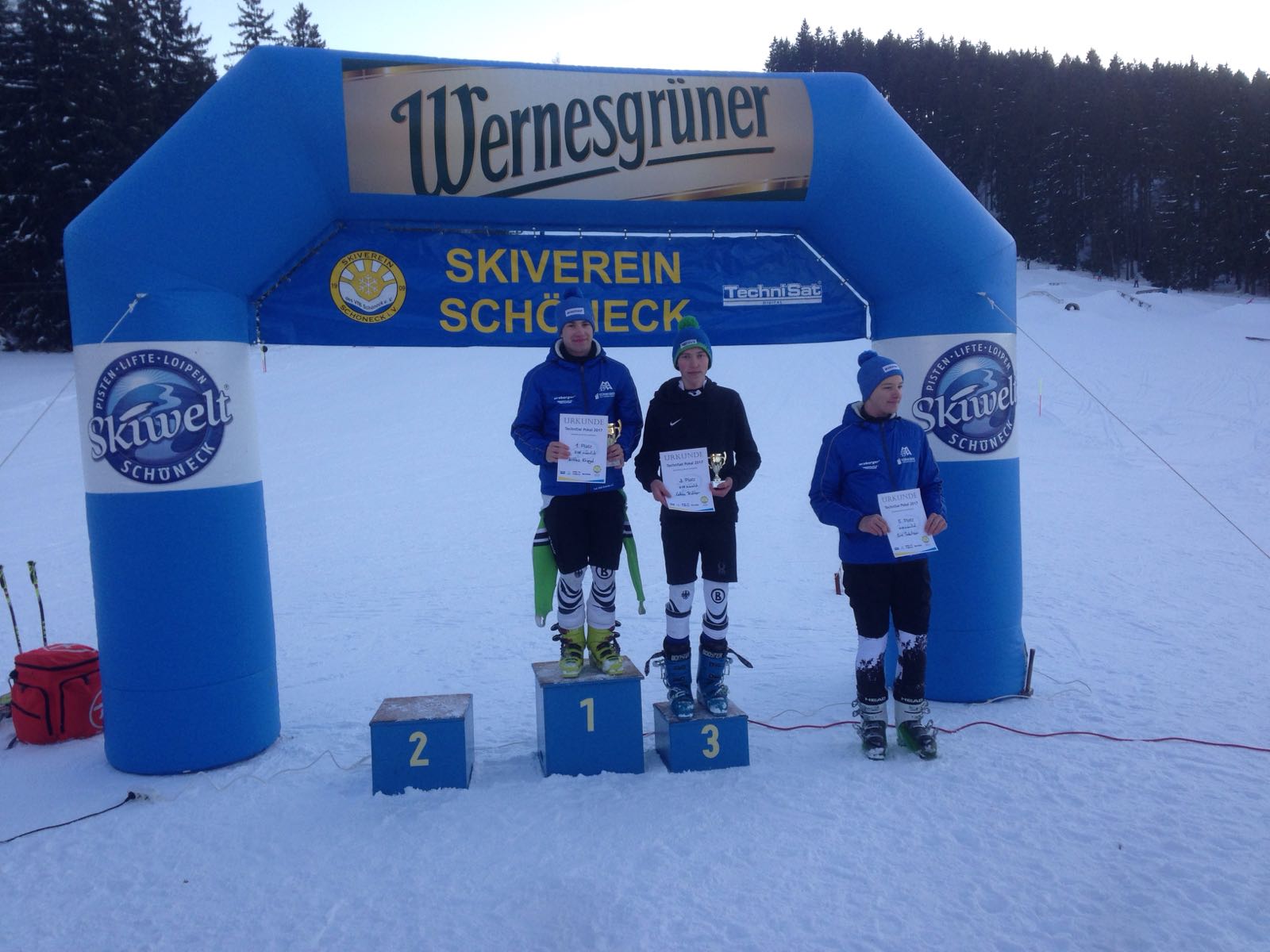Am 22. Januar fuhren Udo und Mike mit Hans, Lukas und Marlene ins sonnige Schöneck zum TechniSat-Pokal. Als erstes durfte Hans unseren Skiclub auf der eisigen Piste in der AK U10 präsentieren. Mit einer soliden ersten Fahrt lag er mit nur 3 Zehntel Rückstand hinter dem Führenden auf dem 2. Platz. Im zweiten Lauf dachte Hans irrtümlicher Weise er hätte einen Torfehler und stieg den Hang wieder ein kleines Stück hinauf. Zum Glück stand Mike am Rennstreckenrand und sah, dass Hans keinen Fehler gemacht hatte und konnte ihn dadurch zum Weiterfahren überzeugen. Am Ende lag er mit einem guten Vorsprung auf Platz 3. Marlene fuhr in der U16 im ersten Lauf auf den 3. Platz, den sie auch im zweiten Durchgang verteidigen konnte. Lukas verlor im ersten Lauf durch einen kleinen Fehler wertvolle Zeit und lag zunächst auf Platz 5. Im zweiten Lauf zeigte er sein ganzes Können und konnte sich dadurch den 3. Platz in der AK U18 sichern.