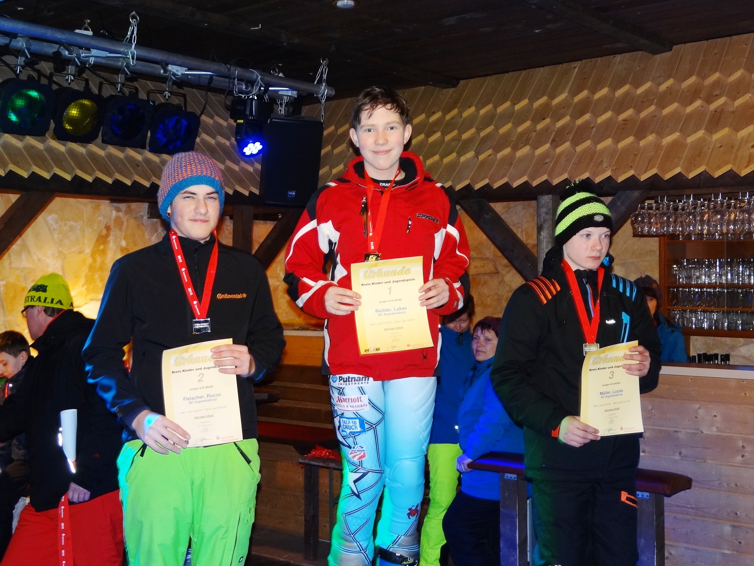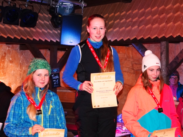 Die ersten Rennen der Saison für unsere Sportler standen mit dem Skihüttenpokal (RS bis AK U21) und dem Masters-Cup (SMC1 - Slalom) in Pobershau auf dem Programm. Die Pobershauer präsentierten uns trotz der ungünstigen Witterung der vergangenen Tage eine eisige und bestens präparierte Piste. Aber das Besondere daran ist ihre Lage mitten im Ort, so dass man vor allem bei einbrechender Dunkelheit das Gefühl hat, auf einem erzgebirgischem Weihnachtsberg unterwegs zu sein. Als es am Nachmittag auch noch leicht zu schneien anfing, war das Wintermärchen perfekt. Perfekt war auch der Auftritt unserer Läufer, die nach kurzer aber intensiver Trainingsphase ihr Können unter Beweis stellten. Vorweg sei gesagt, dass keiner unserer Starter enttäuscht hat, auch wenn es für ganz vordere Plätze vielleicht diesmal noch nicht gereicht hat. In der AK U8 errang Lilly Nötzold einen hervorragenden zweiten Platz und Sten Dieckmann durfte bei den gleichaltrigen Jungen mit Rang Drei ebenfalls auf das Podest klettern. In der AK U10 bestätigten Annabel Diez und Stella Walther ihre guten Trainingsleistungen. Annabel durfte auf das zweithöchste Treppchen steigen während Stella als Vierte mit gerade mal drei Hundertstel Rückstand leider nur die Blechmedaille blieb. Bei den Jungen AK12 verwies Anton Oeser bei seinem Sieg die Konkurrenz erstaunlich deutlich auf die Plätze. Nicht ganz zufrieden dürfte Michelle Schreier sein, die durch einen Patzer im ersten Lauf das Podest leider verfehlte. Maxi Stöckel (U16) fuhr nach Steigerung im zweiten Durchgang auf den Silberrang. Ebenfalls einen hervorragenden zweiten Platz erkämpfte bei den Jungen U16 unser "Extremcarver" Lukas Müller. In dieser Altersklasse wäre sicher auch Lukas Richter ein Medaillenkandidat gewesen, wenn die Konzentration im ersten Lauf ebenso gut wie im zweiten gewesen wäre ;-). Unser Silberquintett wurde durch Robin Reichelt in der AK U21 vervollständigt. Den bereits im Vorfeld verbal geführten internen Wettbewerb um die schnellste Augustusburger Zeit entschied Robin Reichelt mit einer hundertstel Sekunde Vorsprung vor Lucas Müller(!) für sich. Für Lukas Oeser blieb als Trostpreis nur die beste Einzellaufzeit nach Skiwechsel und ein vom Sieger spendiertes Freigetränk. Die kompletten Ergebnislisten sind auf der Internetseite des TSV 1872 Pobershau zu finden. Aus Sicht des Trainers war das ein mehr als gelungener Saisonauftakt. Bemerkenswert war auch diesmal wieder der Teamgeist innerhalb unserer zwanzigköpfigen Mannschaft während des gesamten Rennens. Nun gilt es am nächsten Wochenende den Heimvorteil zu nutzen und die guten Leistungen beim Nachtslalom zu bestätigen. Am Abend konnten dann auch noch unsere etwas betagteren Sportler ihre Beine bewegen, nachdem sie den ganzen Nachmittag als Zuschauer meist im Stehen verbracht hatten. Glücklicherweise war für Stärkung gesorgt und unsere Pobershauer Sportfreunde sorgten für einen zügigen und reibungslosen Rennverlauf. Am Ende hatten alle vier Teilnehmer den Kurs ohne Ausfall gemeistert und durften mit einem Glühwein in der Hand den Blick auf das weihnachtlich hell erleuchtete Dorf genießen. Jeweils zweite Plätze belegten Michael und Peggy Dietz in ihrer AK. Veikko Oeser und Rico Reichelt kamen auf den Plätzen 3 und 5 ein. Die Ergebnisliste steht ebenfalls auf der TSV-Webseite.